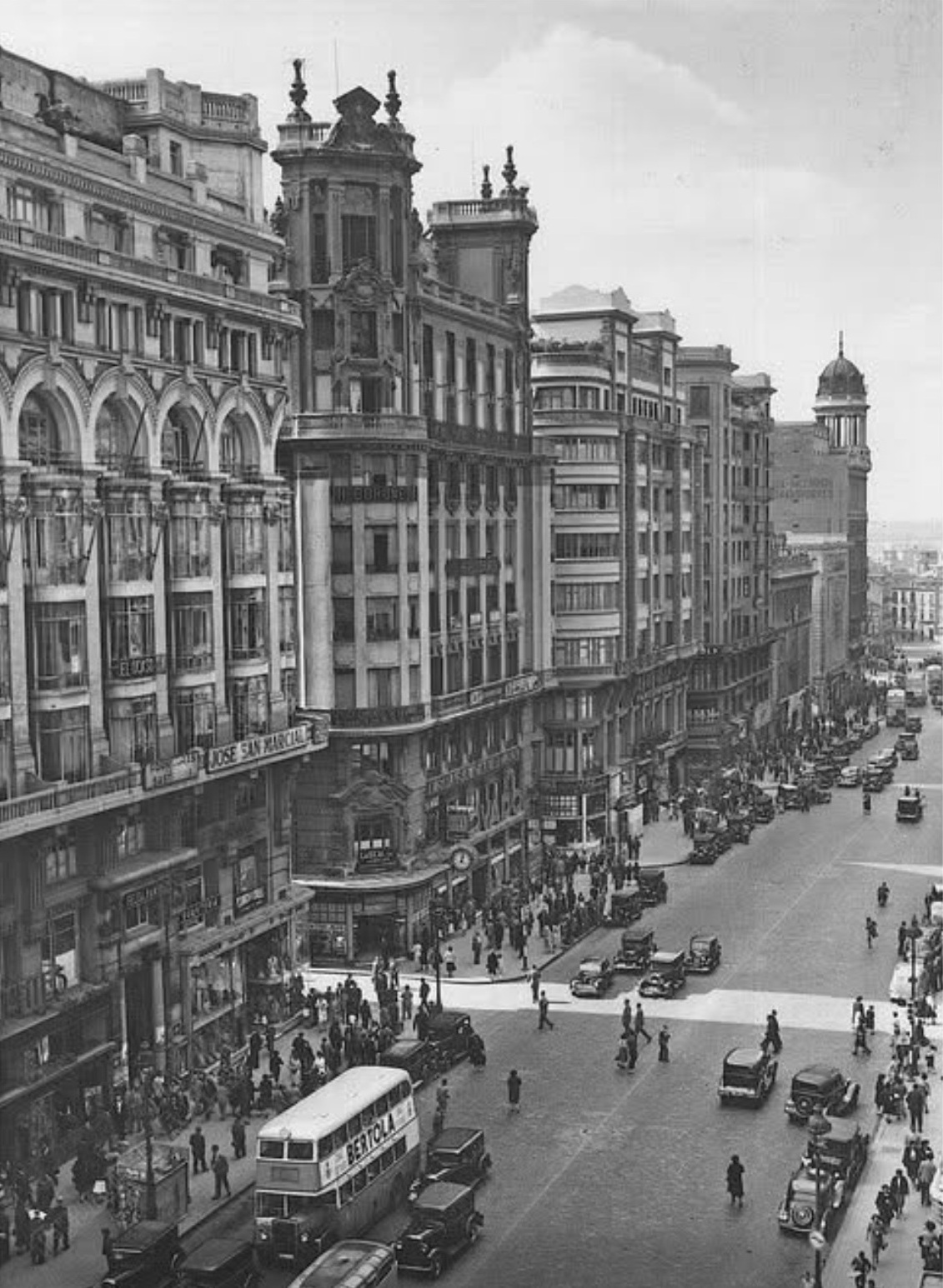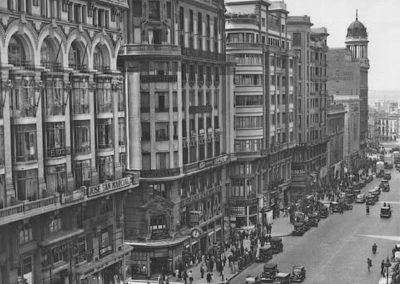 La Gran Vía, que nace en la calle de Alcalá y termina en la plaza de España, fue construida por tramos entre 1910 y 1929.